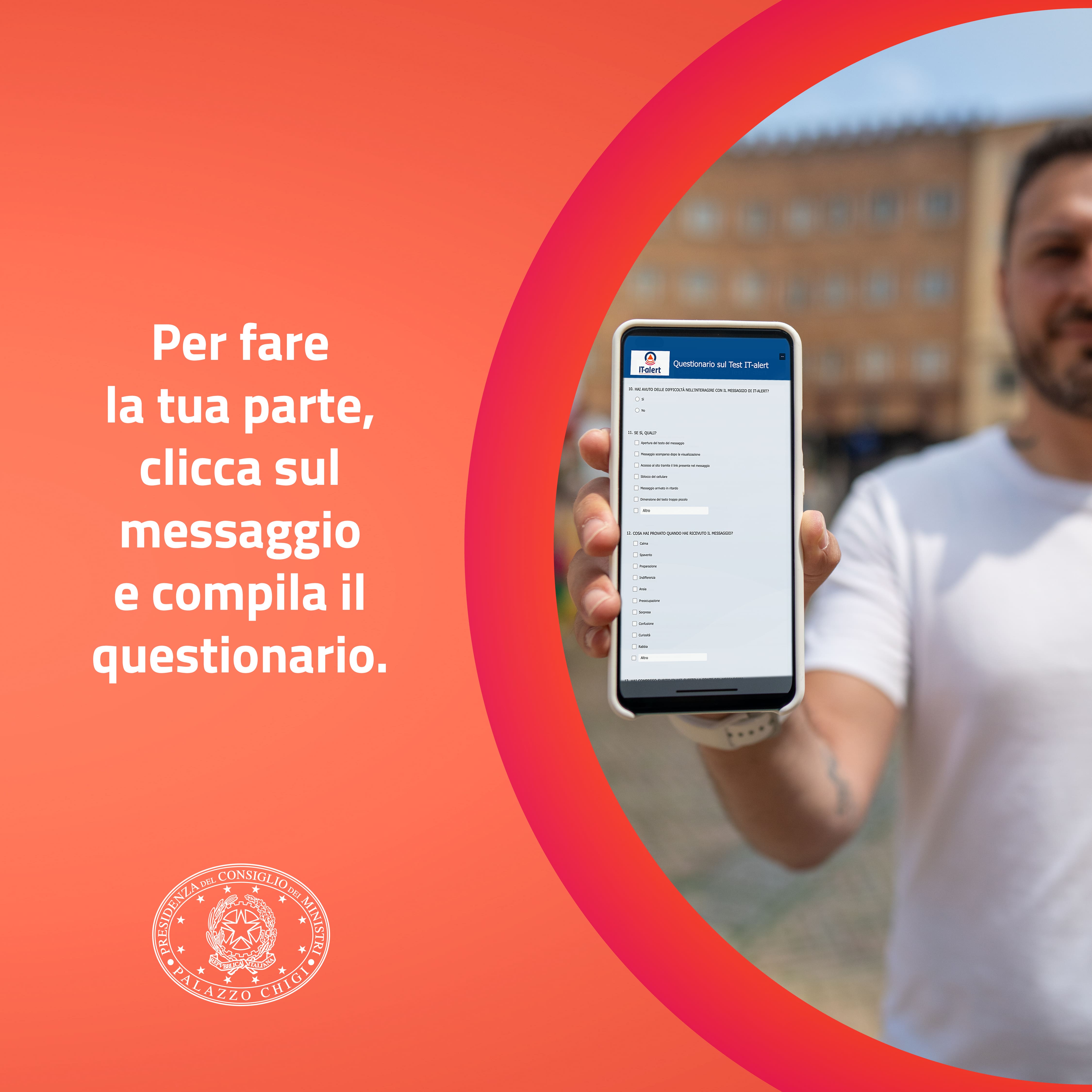Non è necessario iscriversi ad alcun servizio né scaricare alcuna applicazione. Chi riceve il messaggio di test non dovrà effettuare alcuna azione; tutti gli utenti sono invitati a procedere alla compilazione di un apposito questionario, le cui risultanze consentiranno di migliorare lo strumento “IT-alert”.